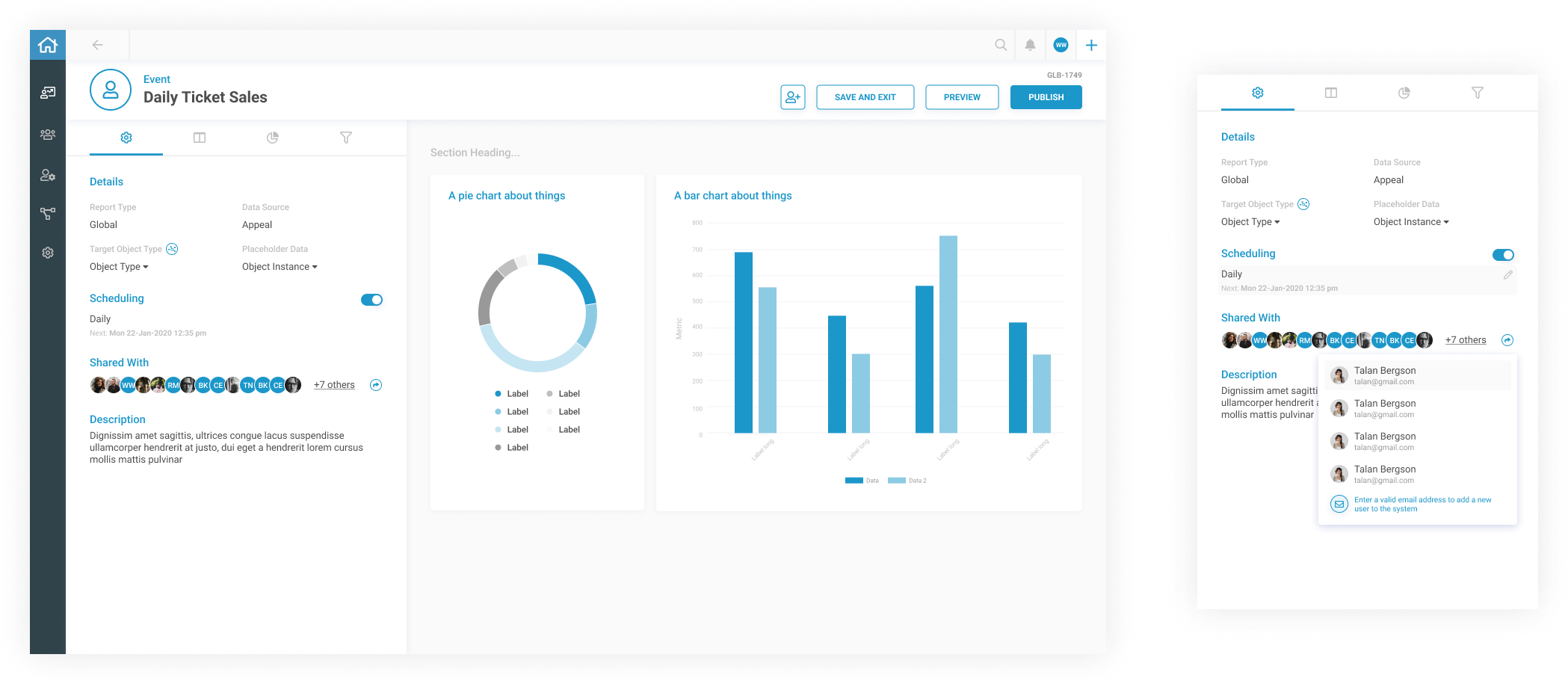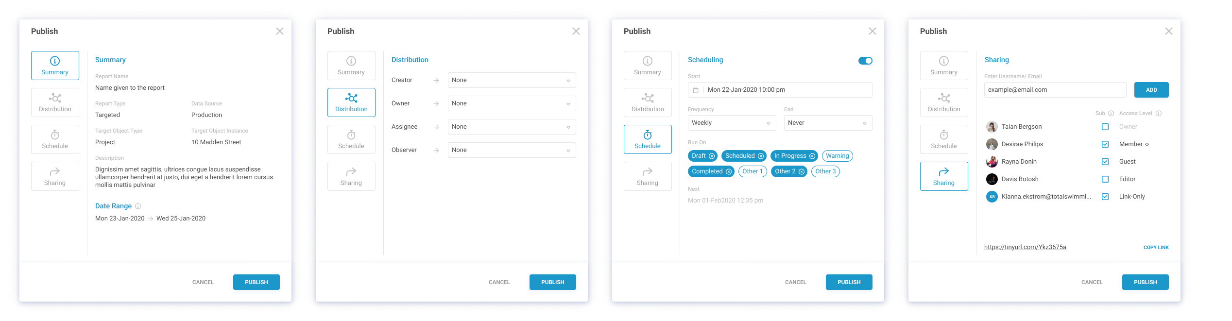 Publish Modal: Summary, Scheduling, Distribution, Sharing & Invitations