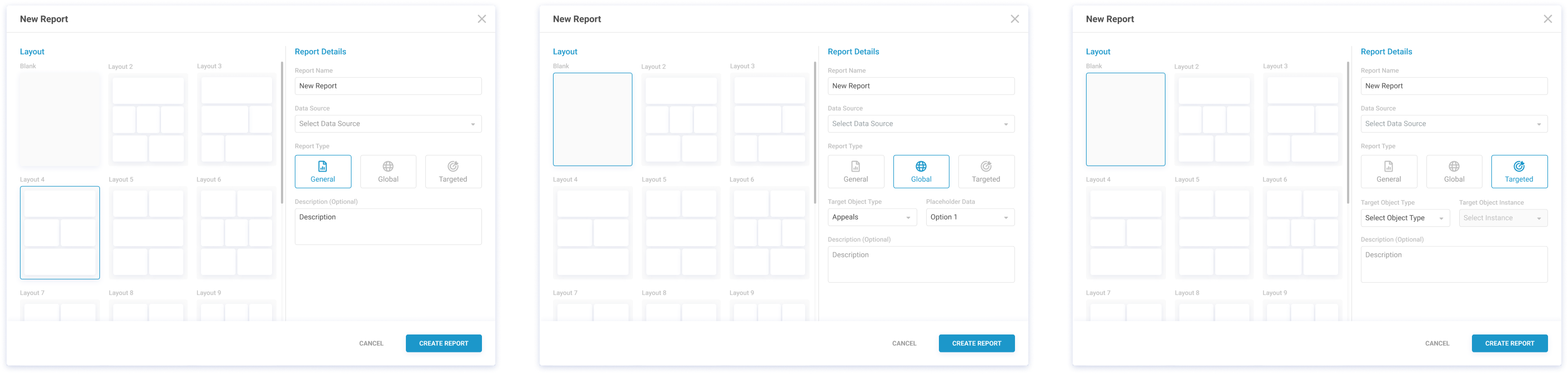 Create Modal: Data Source, Report Type