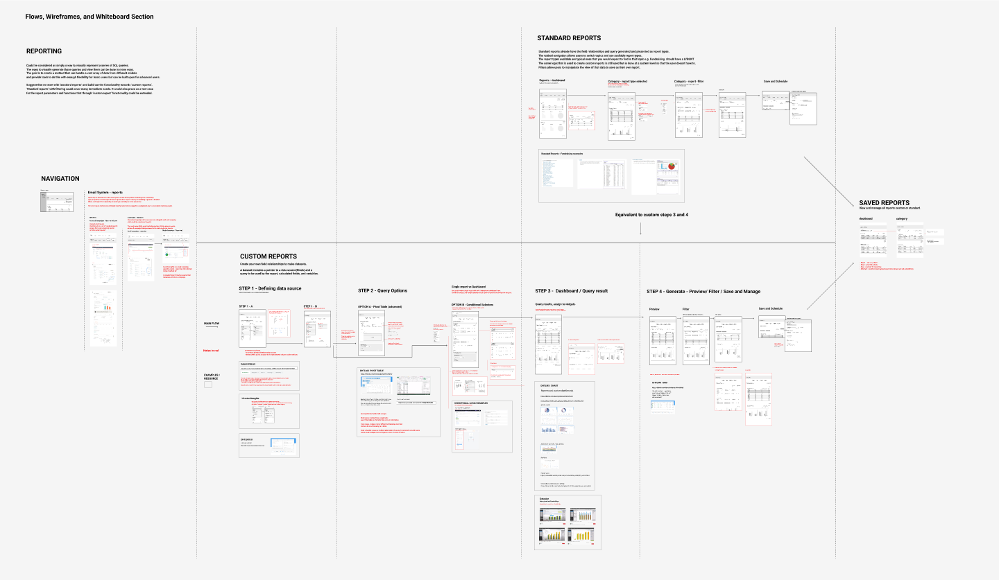 We started with a high-level Information Architecture (IA) to establish the reporting module's structure, followed by developing user journeys to map the experience across key tasks.This was supported by a dynamic process that combined user flows, detailed wireframes, and notes for feature logic.
