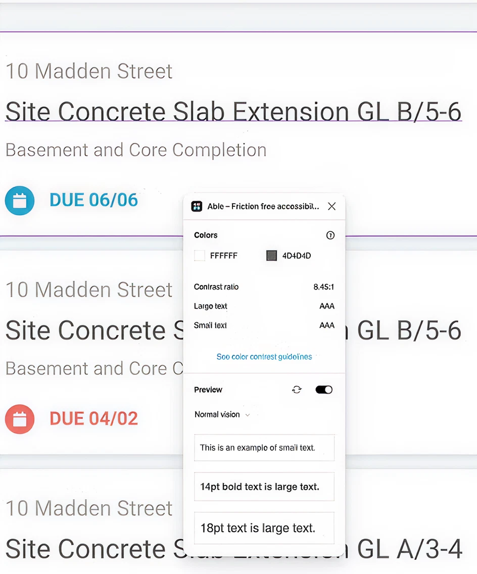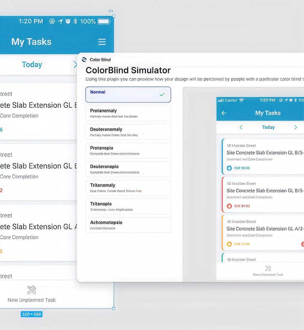 We have studied our end users for the mobile app, focusing on construction workers with color blindness. To ensure inclusivity, we have utilized plugins to double - check the color schemes in our design and verify that they meet accessibility standards.