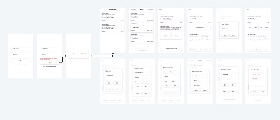 The wireframe phase tackled usability challenges, including progress updates, task navigation, and constraint logging, critical actions for construction management hindered by unclear interfaces and cumbersome workflows.