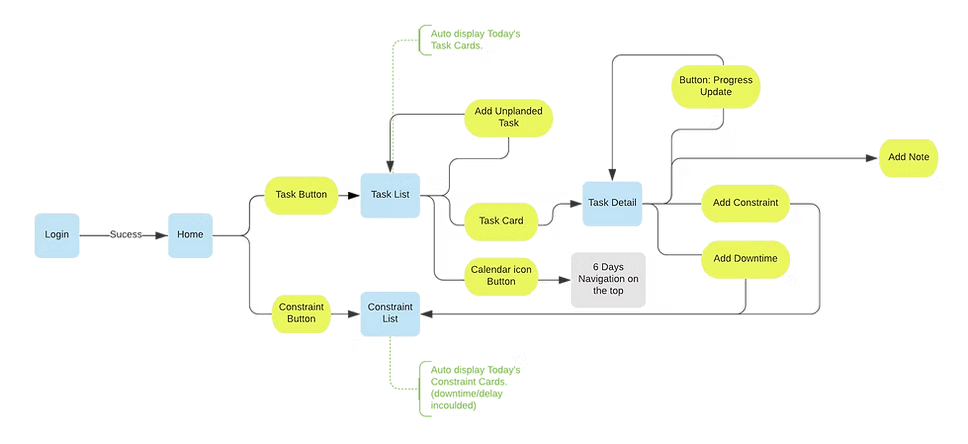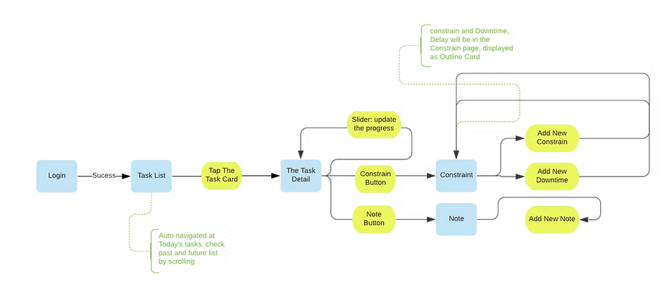 To address this, we developed a streamlined user flow chart, focusing on simplifying task logging and ensuring seamless constraint reporting processes.