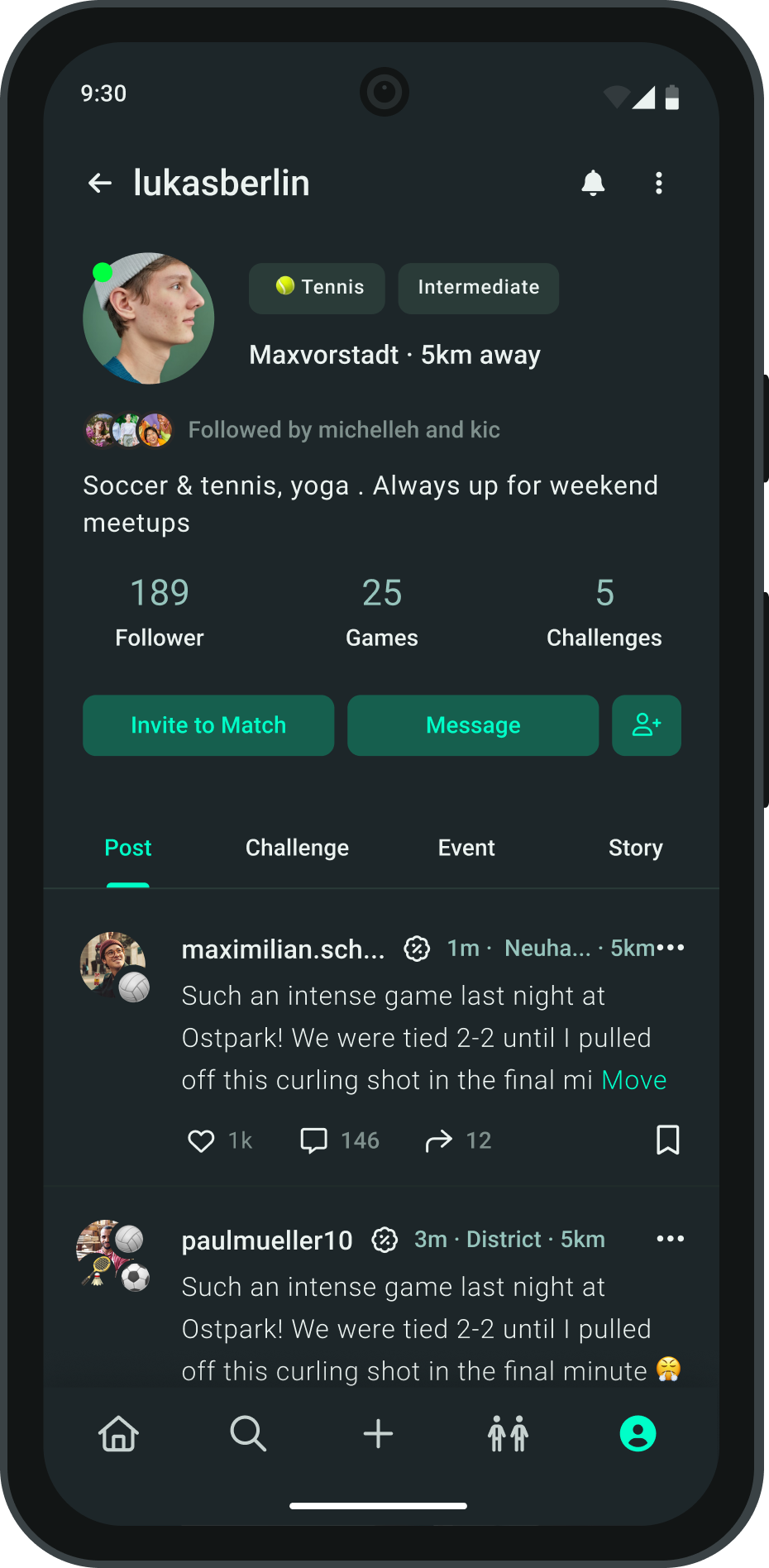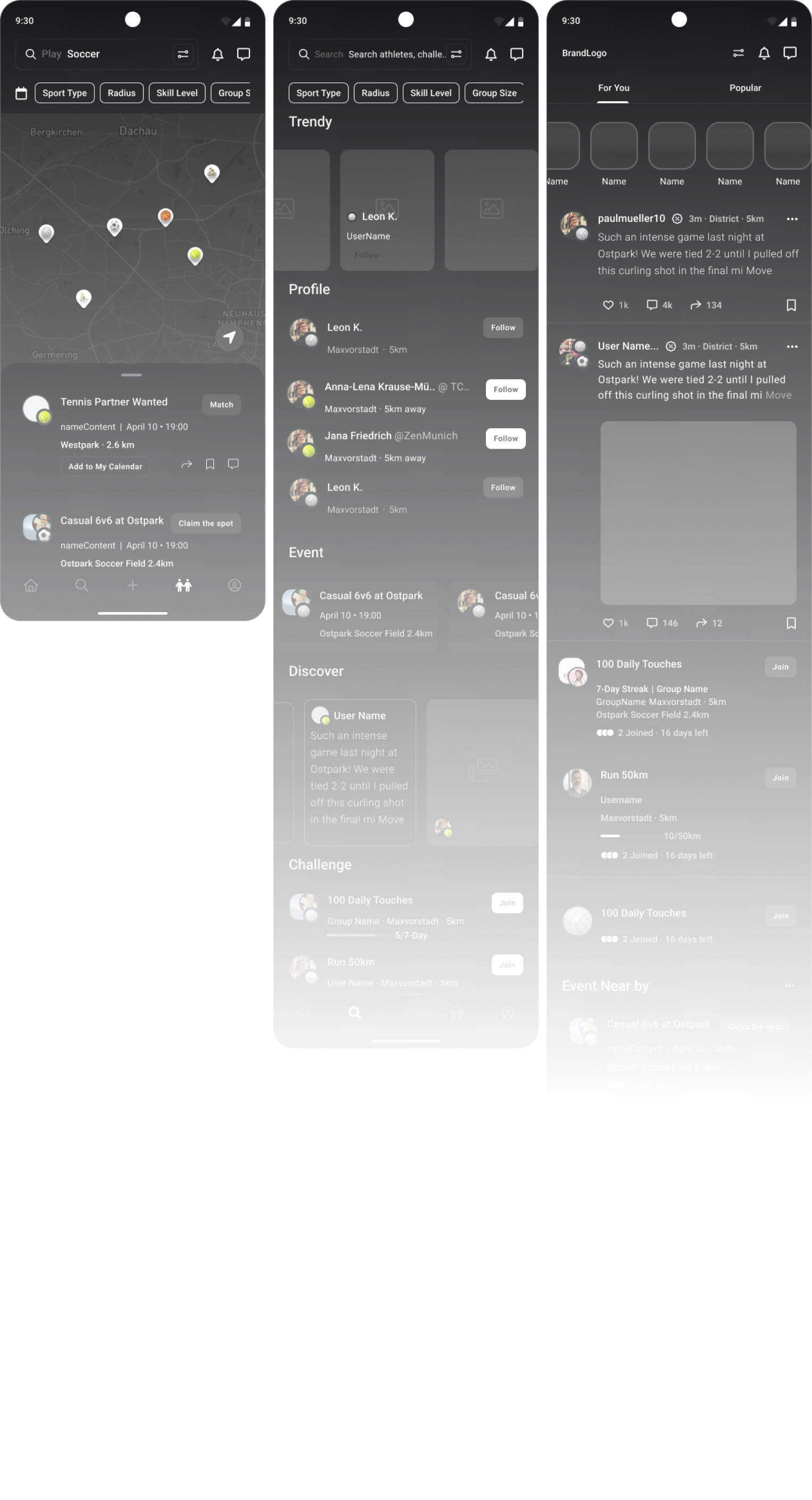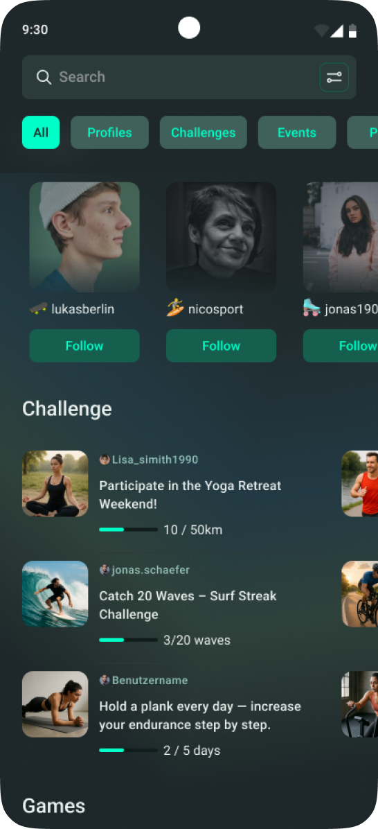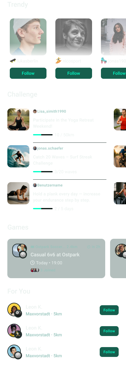 Alongside, users can browse events, discover active profiles, or find casual games, making social fitness feel more approachable and connected.