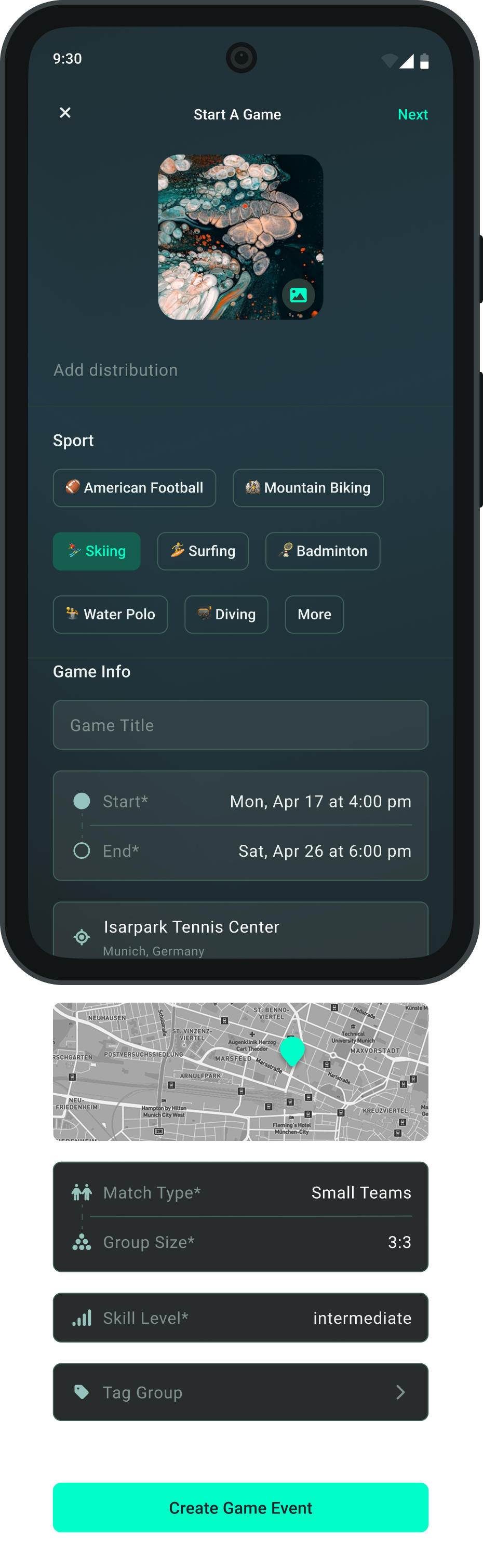 Users can easily create and host sport sessions by setting key details like sport type, time, location, team size, and skill level. All in one adaptive form.